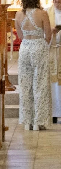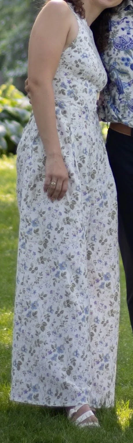 Repurposed bedsheet. Bodice altered for fit. Protea Pants block from Paradise Patterns for pants.